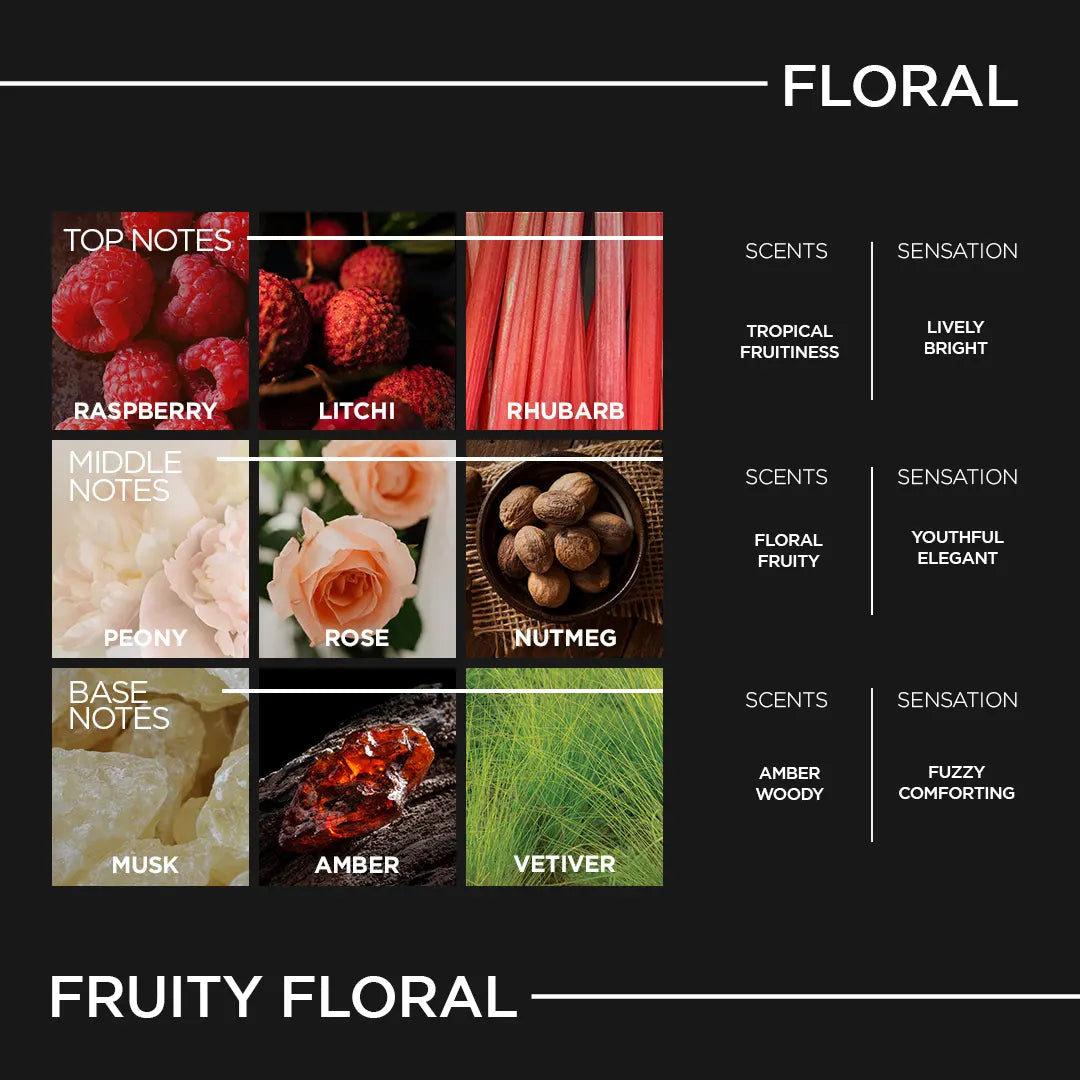 The top notes dance with sweet Litchi, Raspberry, and Rhubarb, creating a lively and fruity introduction. As the scent builds like a melodic crescendo, Rose, Nutmeg, and Peony emerge—rich, romantic, and utterly enchanting. Finally, it settles into warm base notes of Musk, Vetiver, and Amber, leaving a lasting impression that lingers gracefully on the skin.