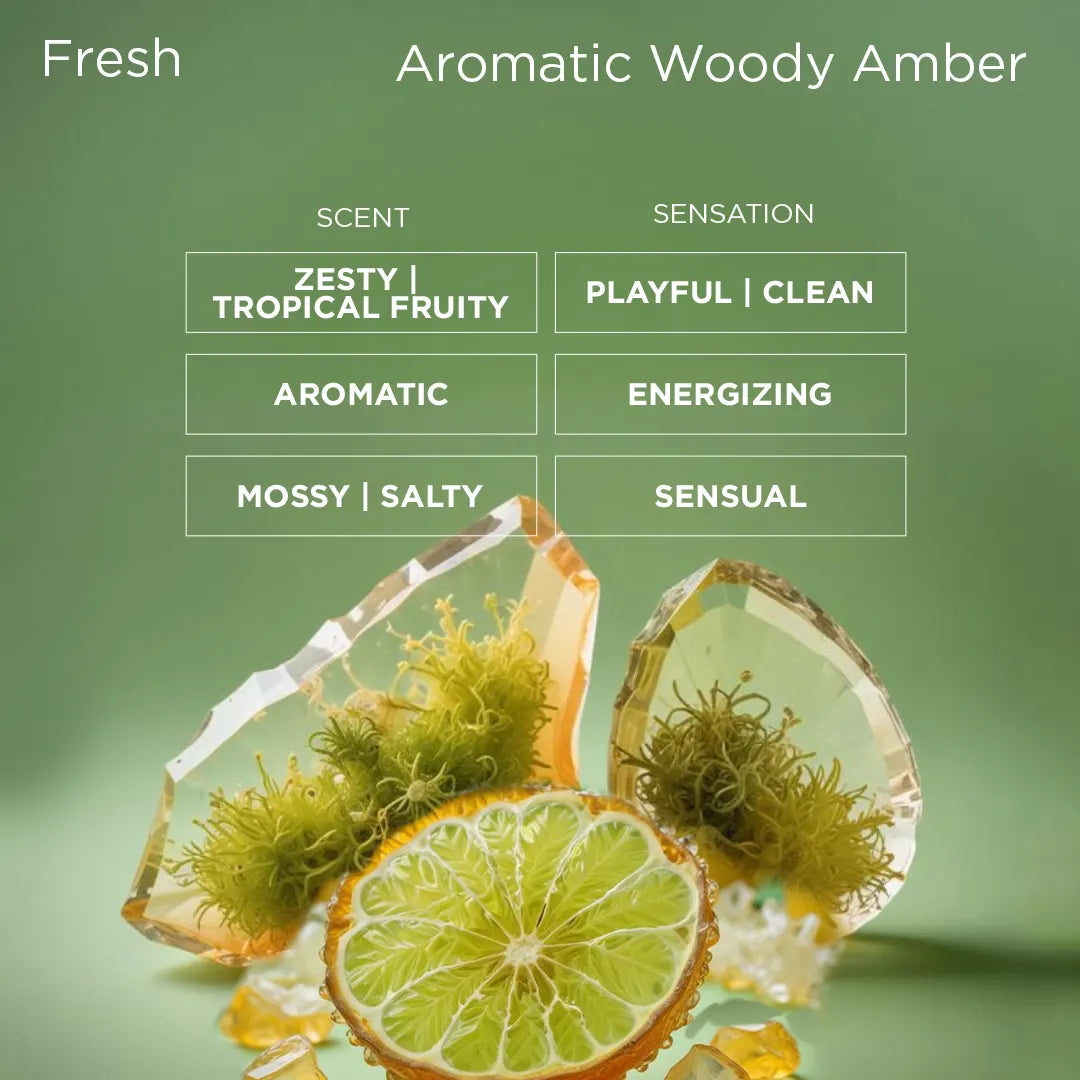 Bright, fresh opening with a powerful woody‑amber base